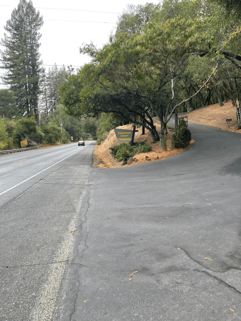 Once I got to the top of the last hill, wouldn’t you know, I ended up with a flat front tire. As I continued walking my bike up the road, I began to contemplate what I could do. No emergency phones in sight. Plenty of homes but most sat off the road a ways so didn’t feel safe approaching them. I kept praying. I stopped at the next street, Shuhn Lane.